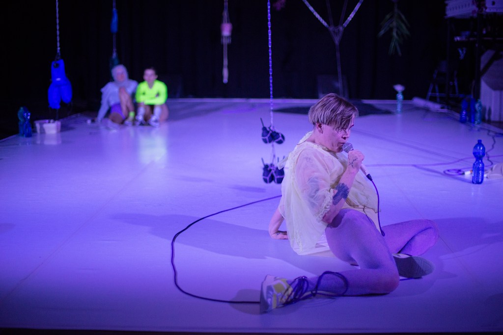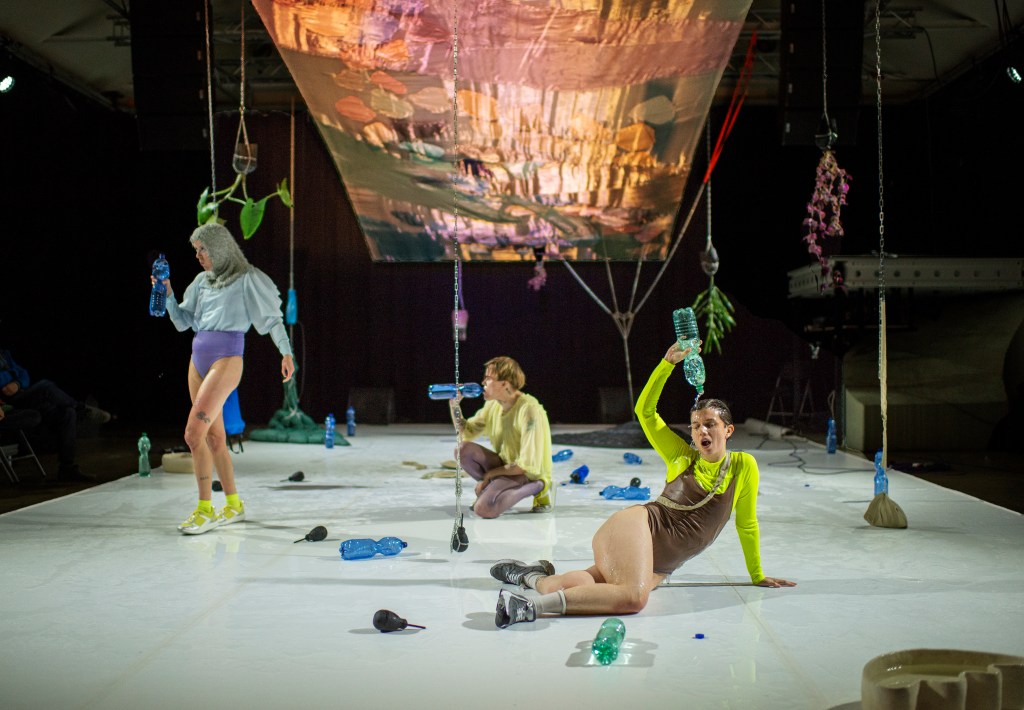 The performance is about transformation, many returns to water, a love for protoplasm, symbiotic living, and breathing to the rhythm of underwater pulses.