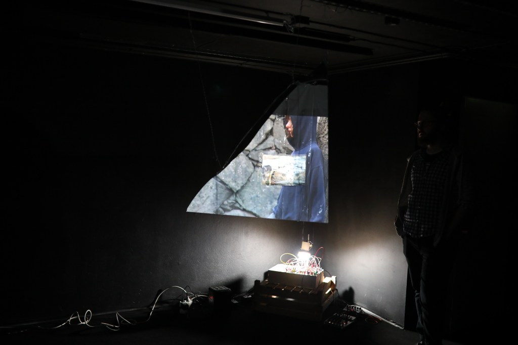 The soundtrack is produced live by a modular synthesiser in a corner of the room. Some parameters are predefined by the patch, but happenings within those parameters are somewhat random within the physical capabilities of the synthesiser. No visitor will hear the exact same soundtrack. No visitor of any artwork has the same experience, even when the elements appear to remain unchanged. Everything the viewer brings into the situation affects the experience. The physical position of the viewer in relation to the artwork, their background and prior knowledge all affect the artwork’s coming to being in a local moment of time.