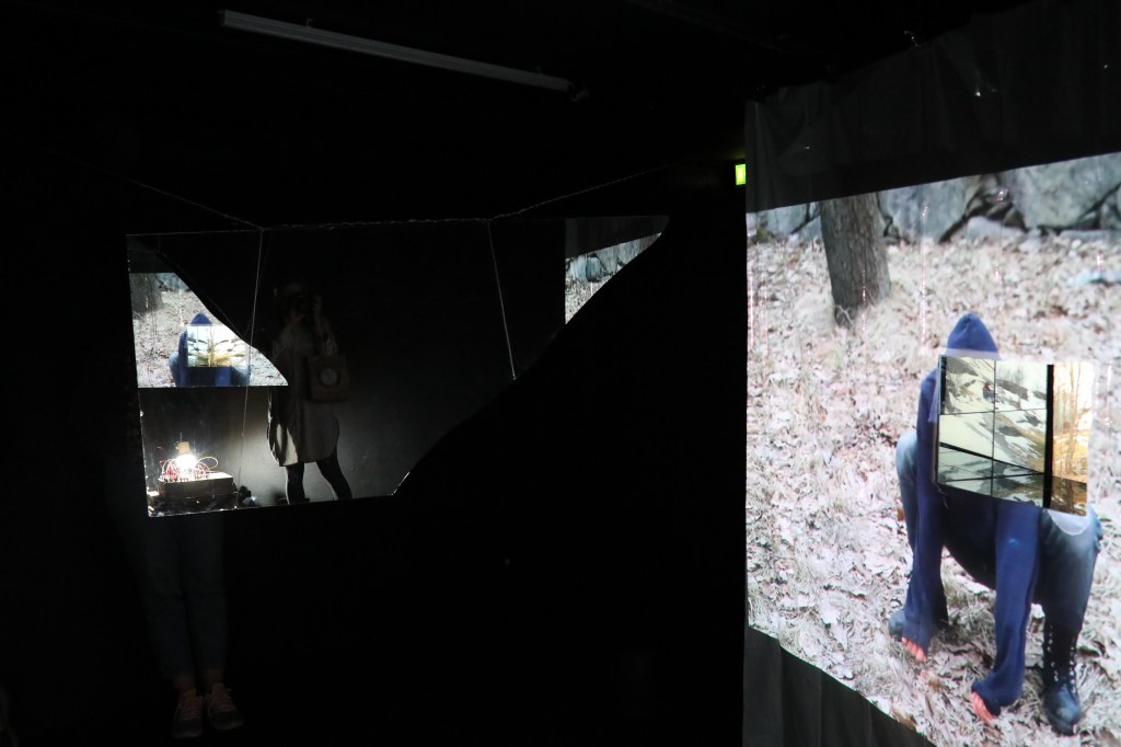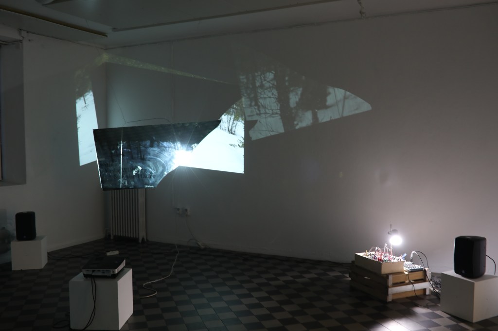 Unlike the audio, the video is a digital recording of past events. Nevertheless, the organised light coming through the lens of the projector is light that has never existed before. It is generated by electricity and ordered into resemblance of previous events by bits. The particular moment is always happening for the first time, the particular waves of light and sound reaching the visitor always do so for the very first time, even if similar things have happened before.